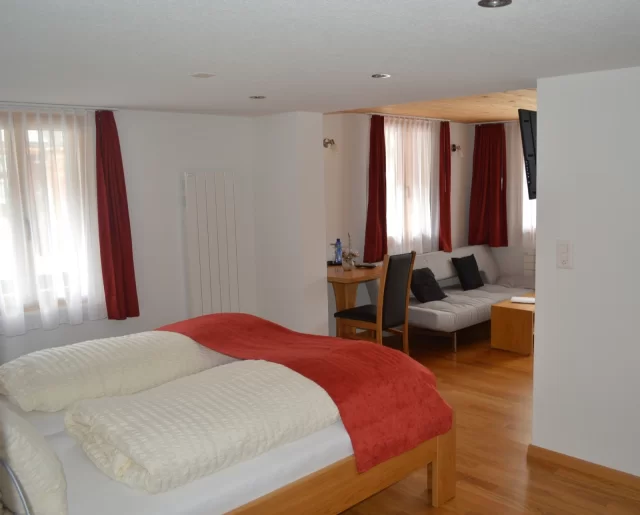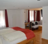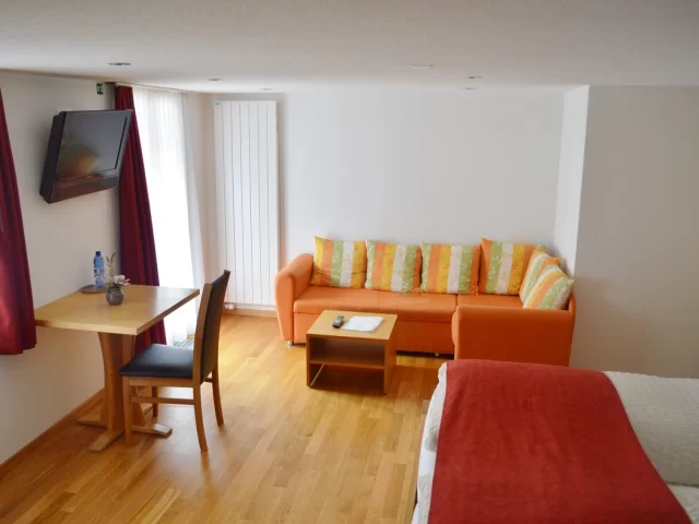 Im Jahr 2010 komplett neu renoviert und möbliert. Grosszügig geschnitten (mind. 32m²). Die zeitgemässe, gleichzeitig heimelige Einrichtung verströmt dank Massivholz ein Gefühl von modernem Komfort und Geborgenheit. Ausstattung: Dusche, Toilette, Fön, TV/Radio (LCD), Sofa, gratis W-LAN, Safe, Balkon zur Süd- und/oder Westseite.
